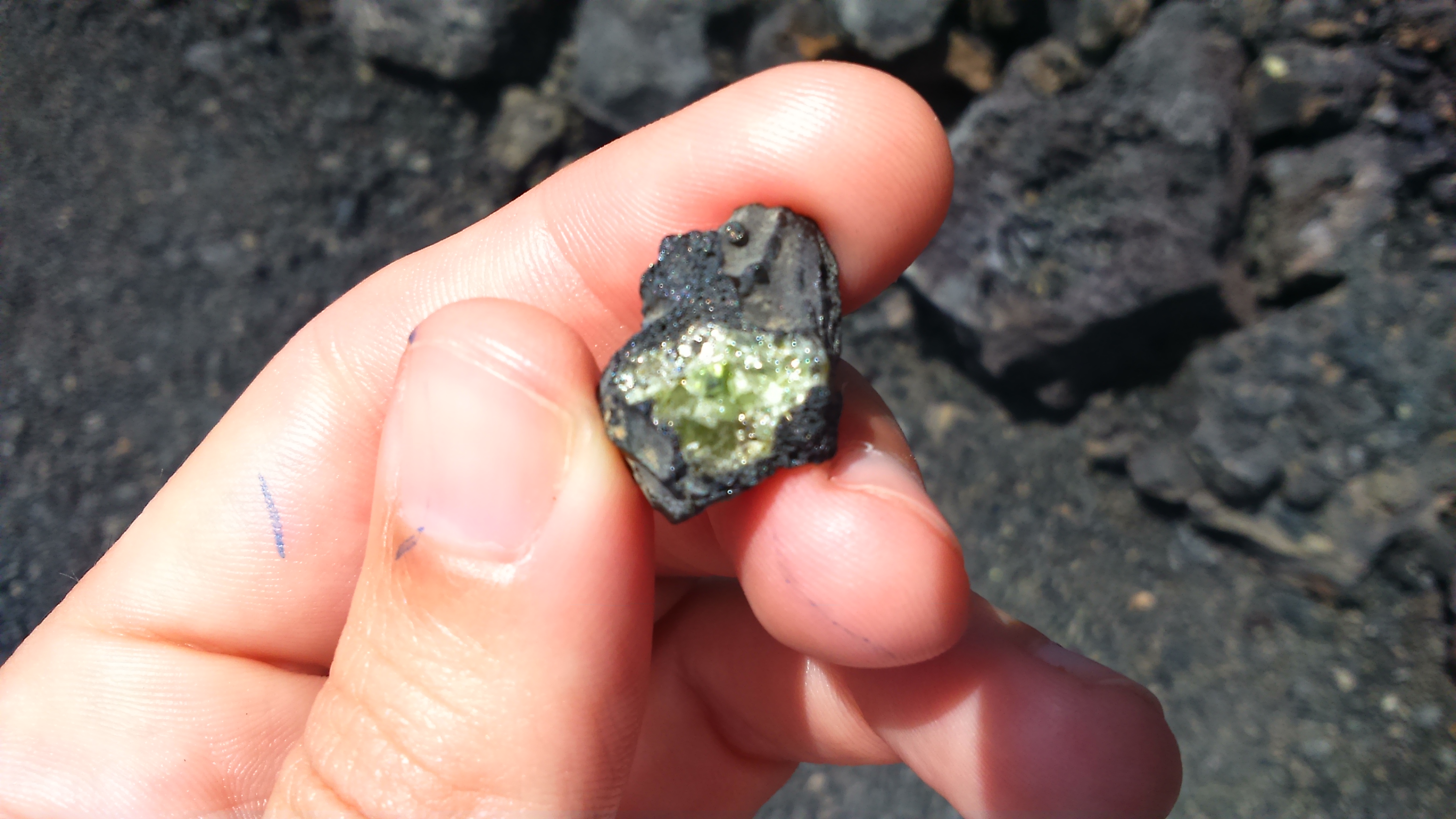 En las faldas del volcán del Cuervo, permanece intacto un pedazo de cráter expulsado por efecto de la explosión. Algunos fragmentos de roca parecen masas de pan petrificadas. La senda que bordea este monumento a la ciencia ficción es una alfombra de pequeños guijarros volcánicos (rofe) entre los que brilla de vez en cuando el verde del olivino, un mineral formado por tetraedros de silicio y oxígeno, y que se encuentra en las rocas ígneas basálticas. No se confundan: no somos Indiana Jones, echárselo al bolsillo está penado por la ley.